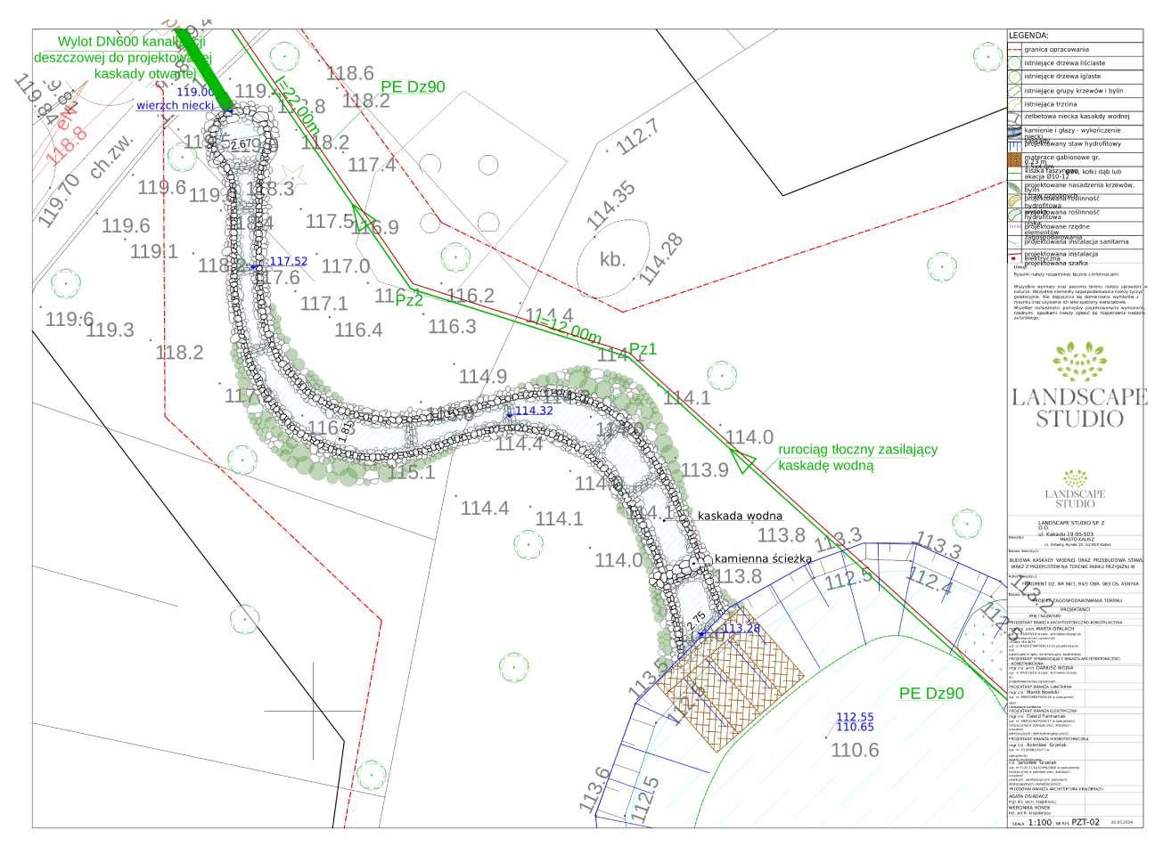 Projekt zakładał wykonanie kaskady wodnej, która miała odbierać wodę deszczową z kanalizacji deszczowej i doprowadzać ją do istniejącego stawu.